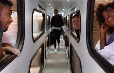 A new company called Cabin is aiming to re-invent the overnight travel experience with private sleeping cabins aboard specially designed buses, similar to Japanese capsule hotels. Dubbed the moving hotel, the service will include 24 sleep pods, coffee service and lounge like a dining car on a train.